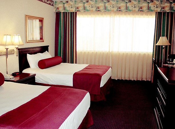 Hotel rooms are non-smoking. Rooms with two Double/Full beds. Located in our North Tower only. Maximum occupancy 4. (Extra person fee applies.) Room location and requests are based on availability at time of check-in. Rooms are not pre-assigned. Room requests may be guaranteed for a fee by contacting the Reservation Department at Four Queens Hotel.