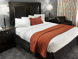 This contemporary suite measures approximately 500 square feet. It has a California king bed with a pillow-top mattress. In addition, there's a sectional sofa with a pull-out queen-sized bed. The suite is decorated with an art deco theme and features eye-catching vintage artwork. Other amenities include a 50-inch flat-panel TV, an iHome clock radio (compatible with both iPhones and iPads) and a comfortable work space as well as a hair dryer and an in-room safe.