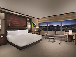 This 811-square-foot suite has one king bed with a custom-designed pillow-top mattress by Sealy and a pullout queen-sized sofa bed. Offering 270-degree views of Las Vegas through expansive picture windows, the floor plan includes a fully equipped gourmet kitchen with stainless steel refrigerator, a four-burner electric cook top and microwave, a stainless steel refrigerator and a dining table with seating for four. There's a washer and dryer and a laptop-size electronic safe. This suite also includes a media hub for MP3 players, cameras, DVD players and game consoles as well as flat-screen televisions in the living and bedroom areas. This is a nonsmoking room ( a $500 cleaning fee will be applied for smoking).